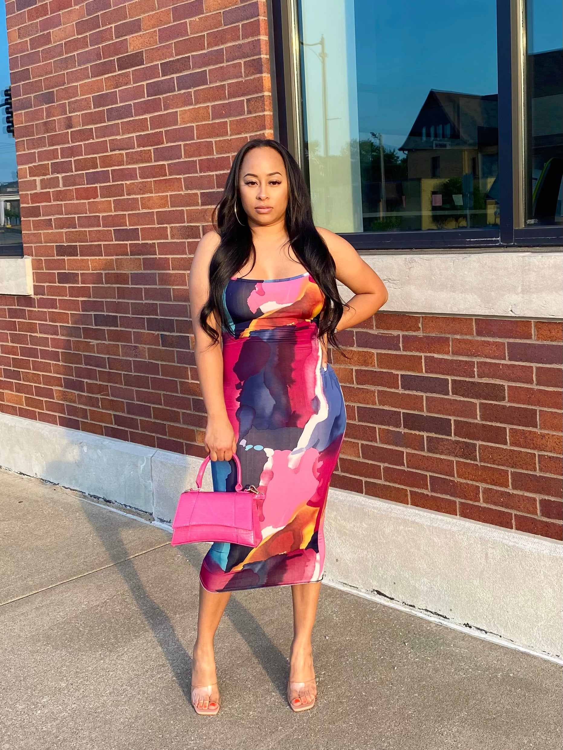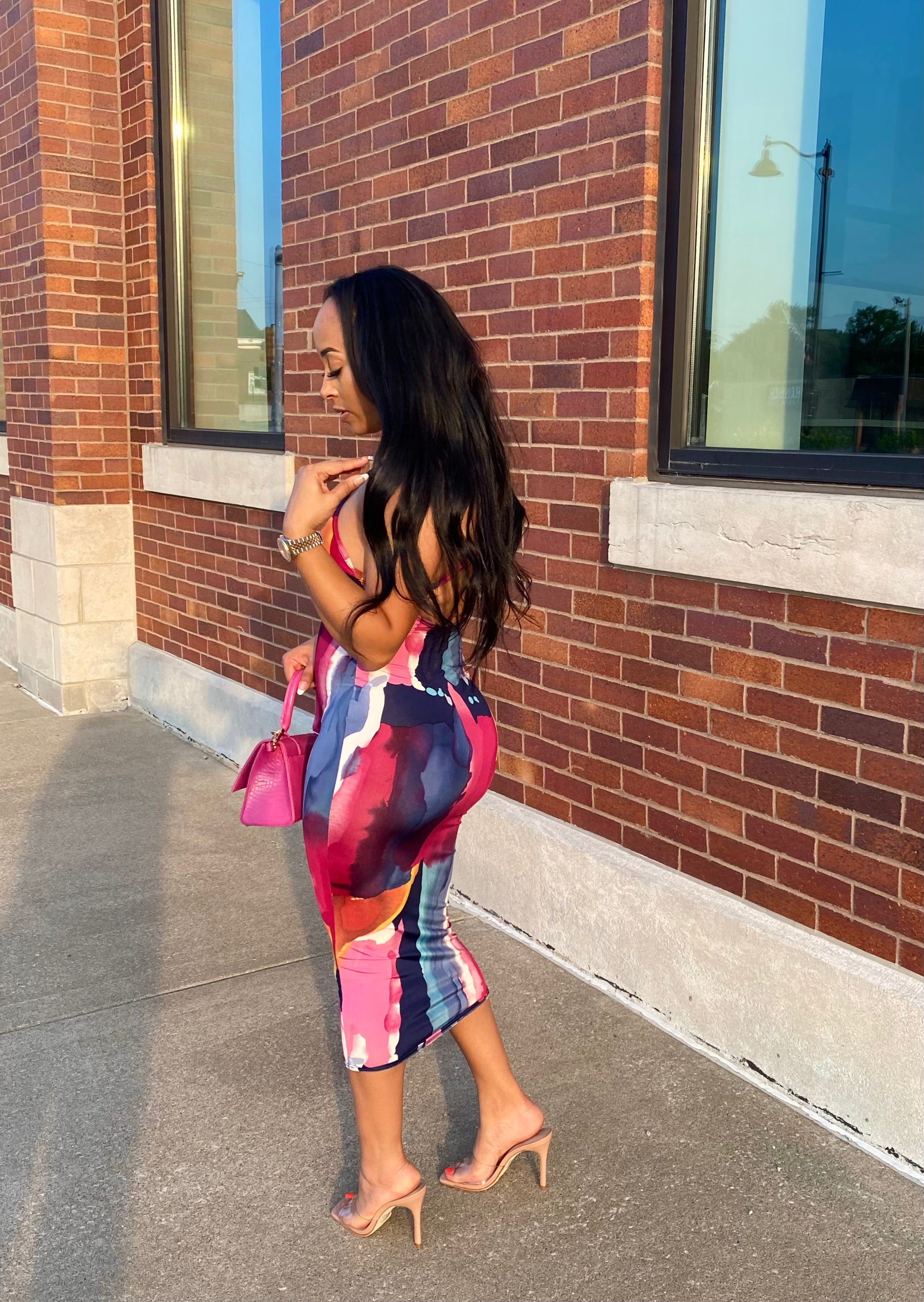 A mood-boosting midi that instantly steals the show. Designed with a bold geometric print and delicate spaghetti cross-back straps, this dress blends comfort with statement style. Lightweight, stretchy, and perfect for warm summer days — just slide into sandals and let the dress do the rest.