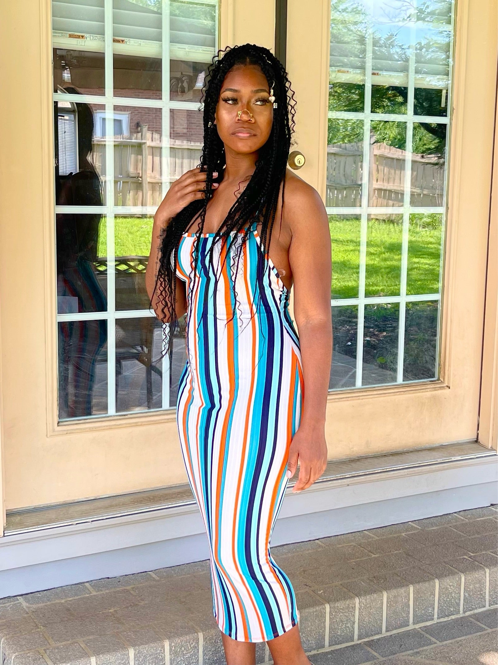 A vibrant striped midi that brings color and confidence to your day. This easy, comfortable dress features bold orange, mint, and navy stripes with a strappy crisscross back for a playful touch. Soft, stretchy, and effortless — just add sandals or heels and you’re done.