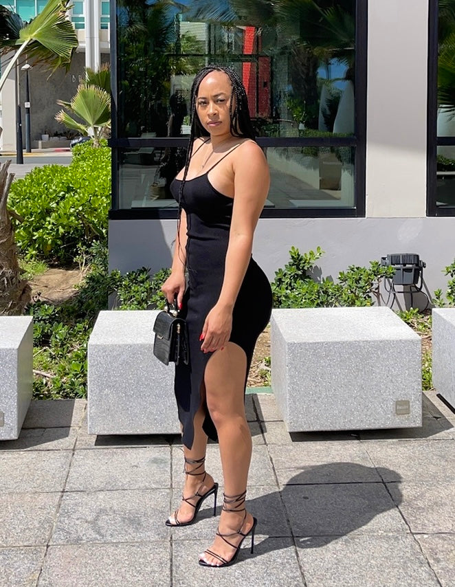 A sleek, body-hugging cami dress made for the moments you want to keep it simple and sexy. This soft ribbed knit features thin cami straps, a square neckline, and a thigh-high side slit that adds just enough edge. Easy to dress up with heels or keep minimal with sandals — either way, it’s an effortless statement.
